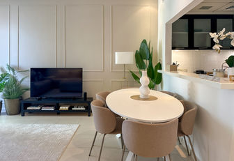 The large lounge includes a double sofa-bed, dining table for 6, smart TV with Netflix and separate balcony with seating and table for al fresco dinners and drinks.